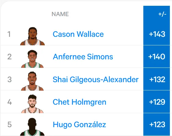 [流言板]過(guò)去一個(gè)多月正負(fù)值前五:雷霆三人入選,安芬尼