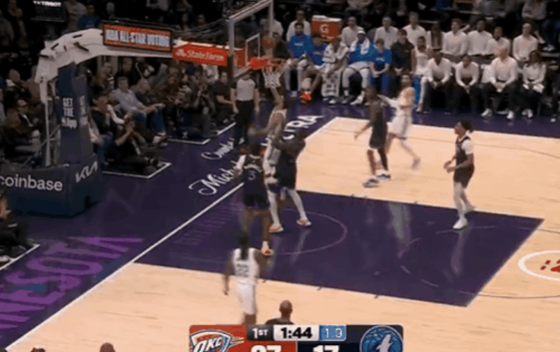 第一節(jié)比賽,大妙打進(jìn)切特接亞歷山大妙傳籃下再打進(jìn),傳籃雷霆首節(jié)領(lǐng)先森林狼12分。下再