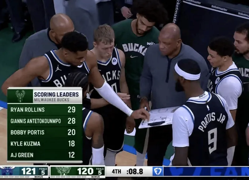 隨后據(jù)現(xiàn)場視頻顯示,雄鹿在暫停時,由字母哥在場邊畫戰(zhàn)術(shù)。