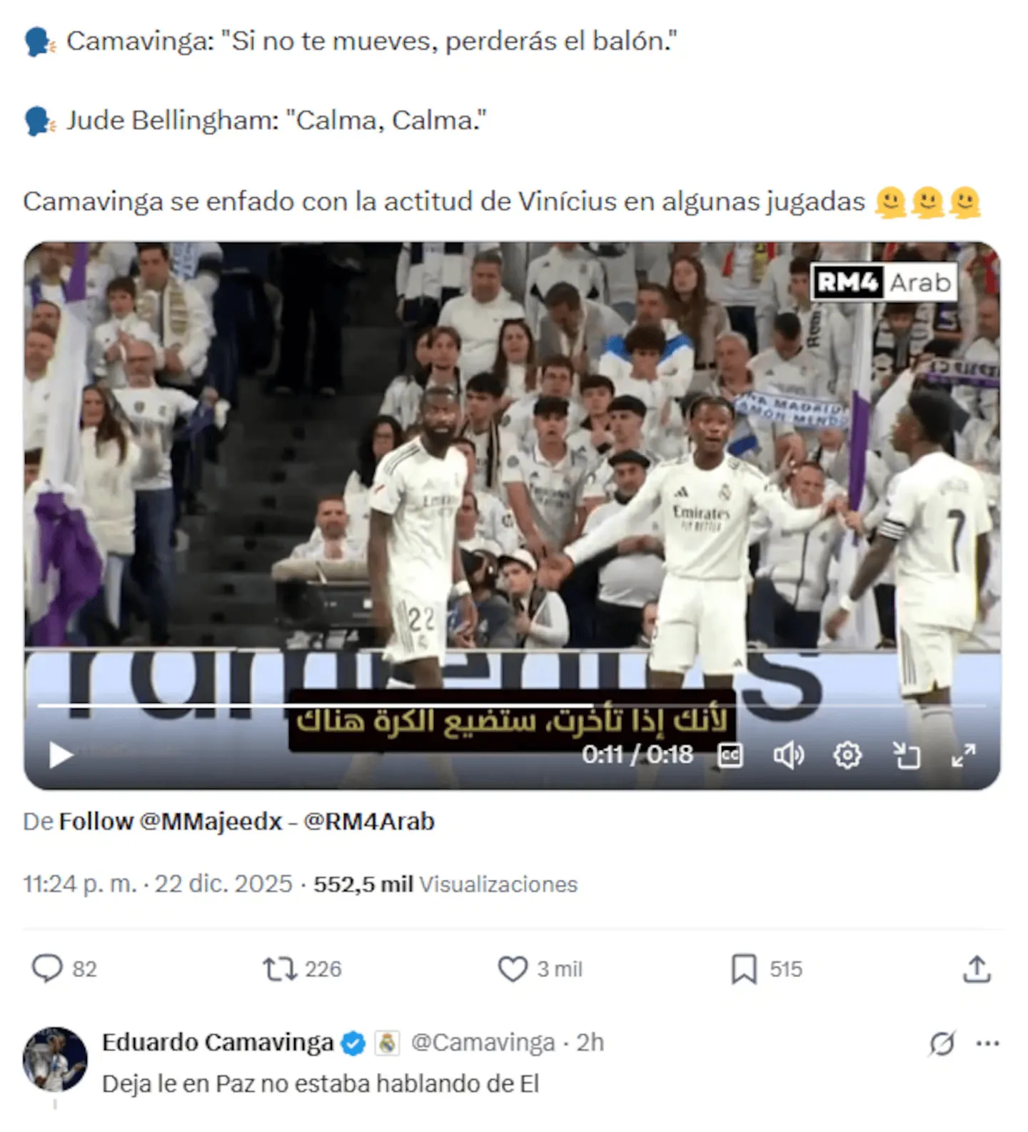 虎撲12月23日訊 近日,圍繞皇馬中場卡馬文加與隊友維尼修斯之間關(guān)系的討論在社交媒體上發(fā)酵。對此,卡馬文加本人已在社交平臺X上作出回應(yīng),否認自己在比賽中對維尼修斯不滿或進行指責(zé)。