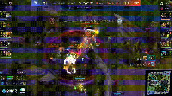 虎撲05月04日訊 T1對陣KT首局,KT野區(qū)反打被擊潰,混換T1混戰(zhàn)中拉扯打出1換4大勝
