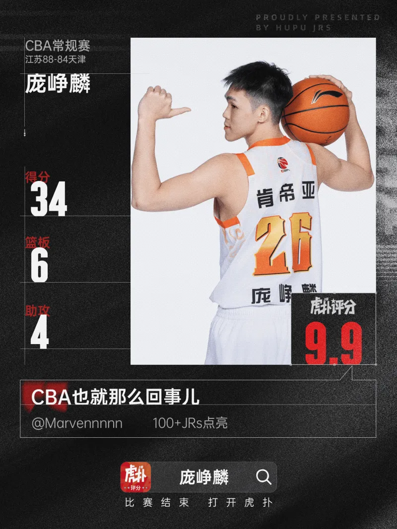 江蘇球員龐崢麟出戰(zhàn)37分鐘,投籃14中10、三分5中3砍下34分6籃板4助攻1搶斷。