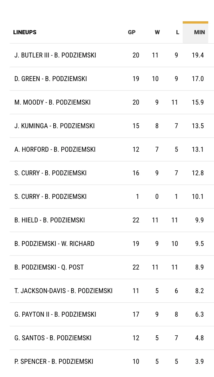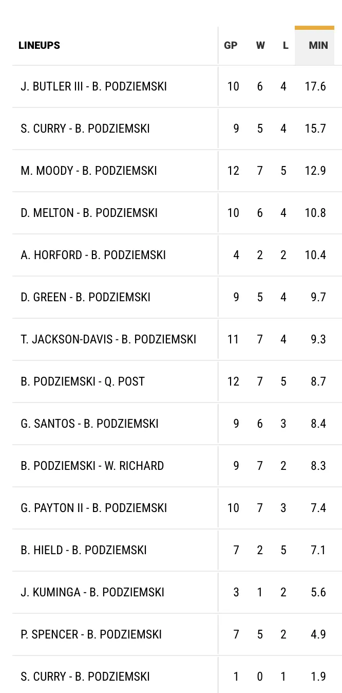 梅爾頓復(fù)出后,波杰搭配最多的是巴特勒(17.6),庫里(15.7),穆迪(12.9),梅爾頓(10.8)和霍福德(10.4)。