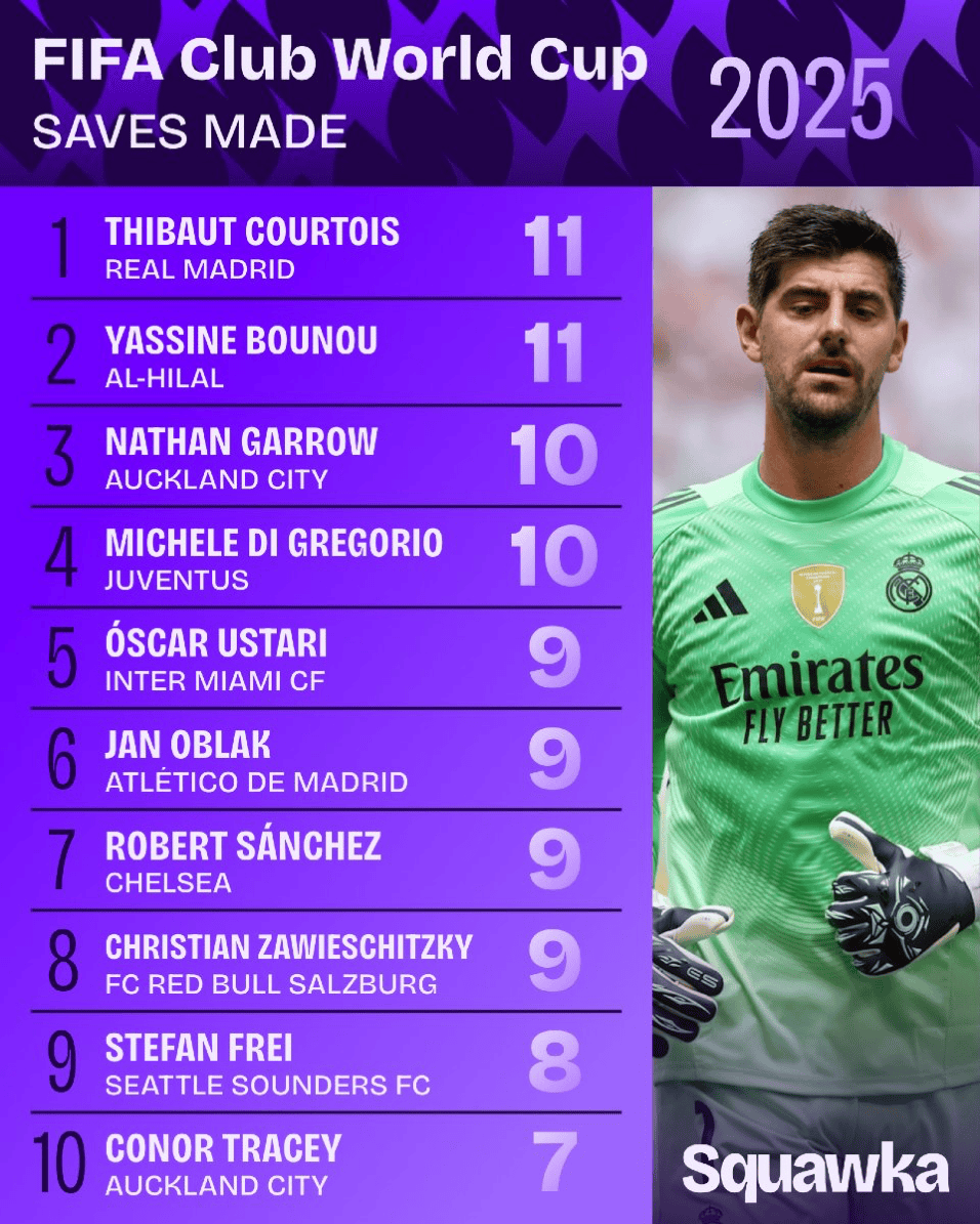 虎撲06月23日訊 世俱杯正在火熱進(jìn)行中,Squawka整理了一份關(guān)于參賽門將的爾圖撲救數(shù)據(jù)榜單。