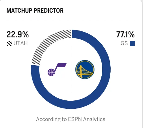 賽前,流言率爵率美媒ESPN預(yù)測本場比賽,測明勇士勝率77.1%,日比爵士勝率22.9% 。