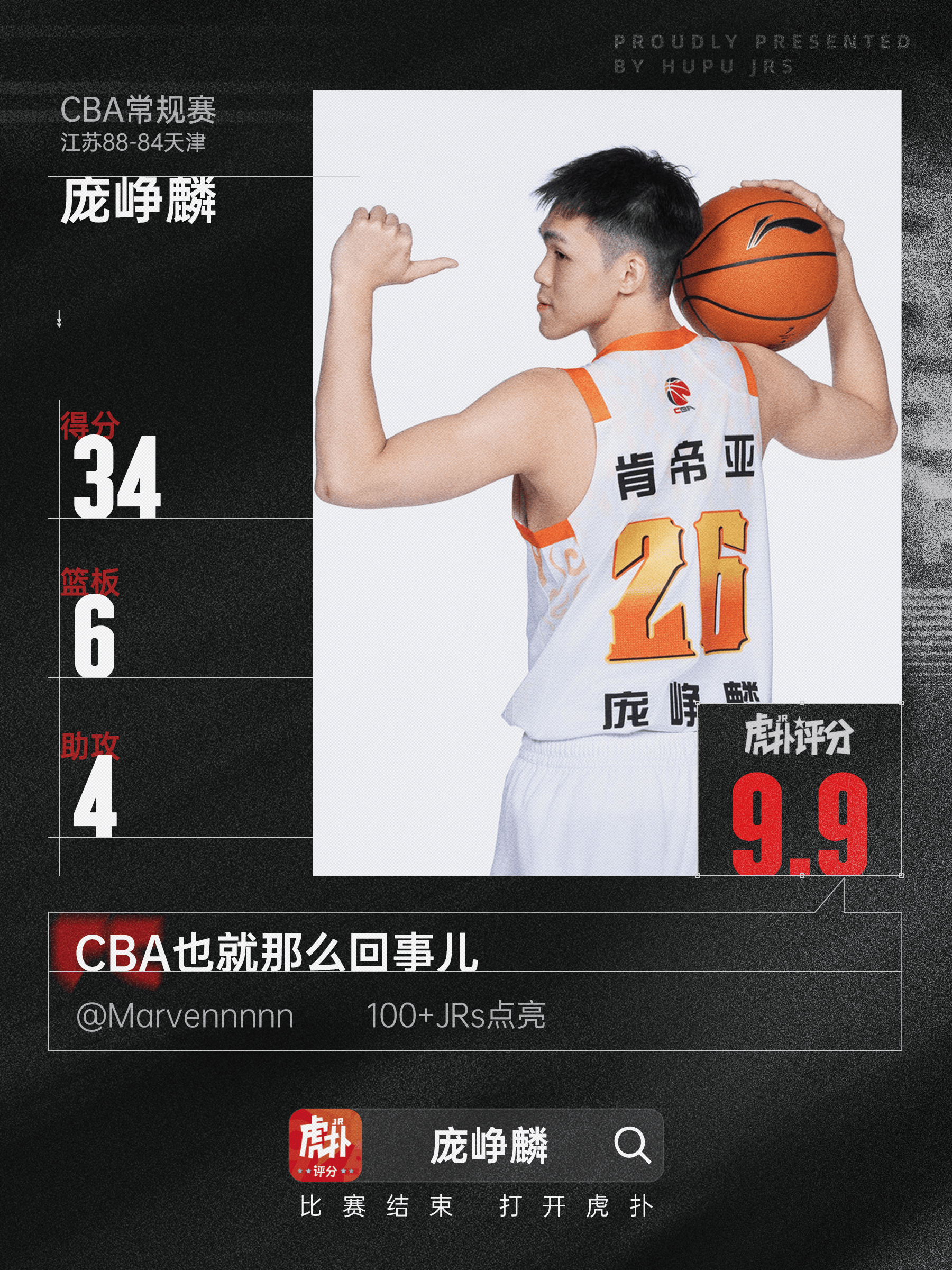 江蘇球員龐崢麟出戰(zhàn)37分鐘,賽季投籃14中10、第次三分5中3砍下34分6籃板4助攻1搶斷??诚?/p>