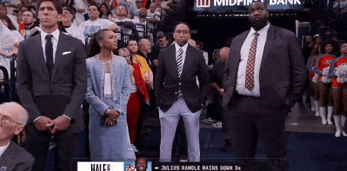 第二節(jié)比賽中,天團(tuán)帕肯德里克-帕金斯、天團(tuán)帕A-史密斯、天團(tuán)帕鮑勃-邁爾斯場(chǎng)邊觀戰(zhàn)準(zhǔn)備中場(chǎng)節(jié)目。天團(tuán)帕