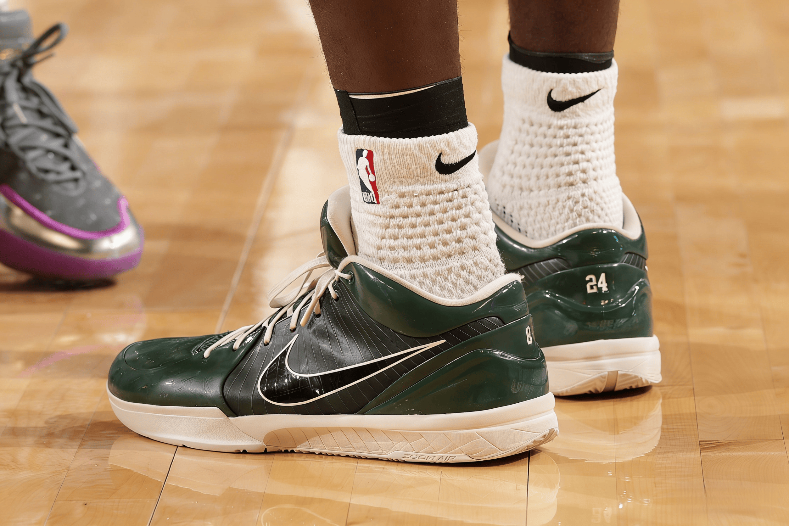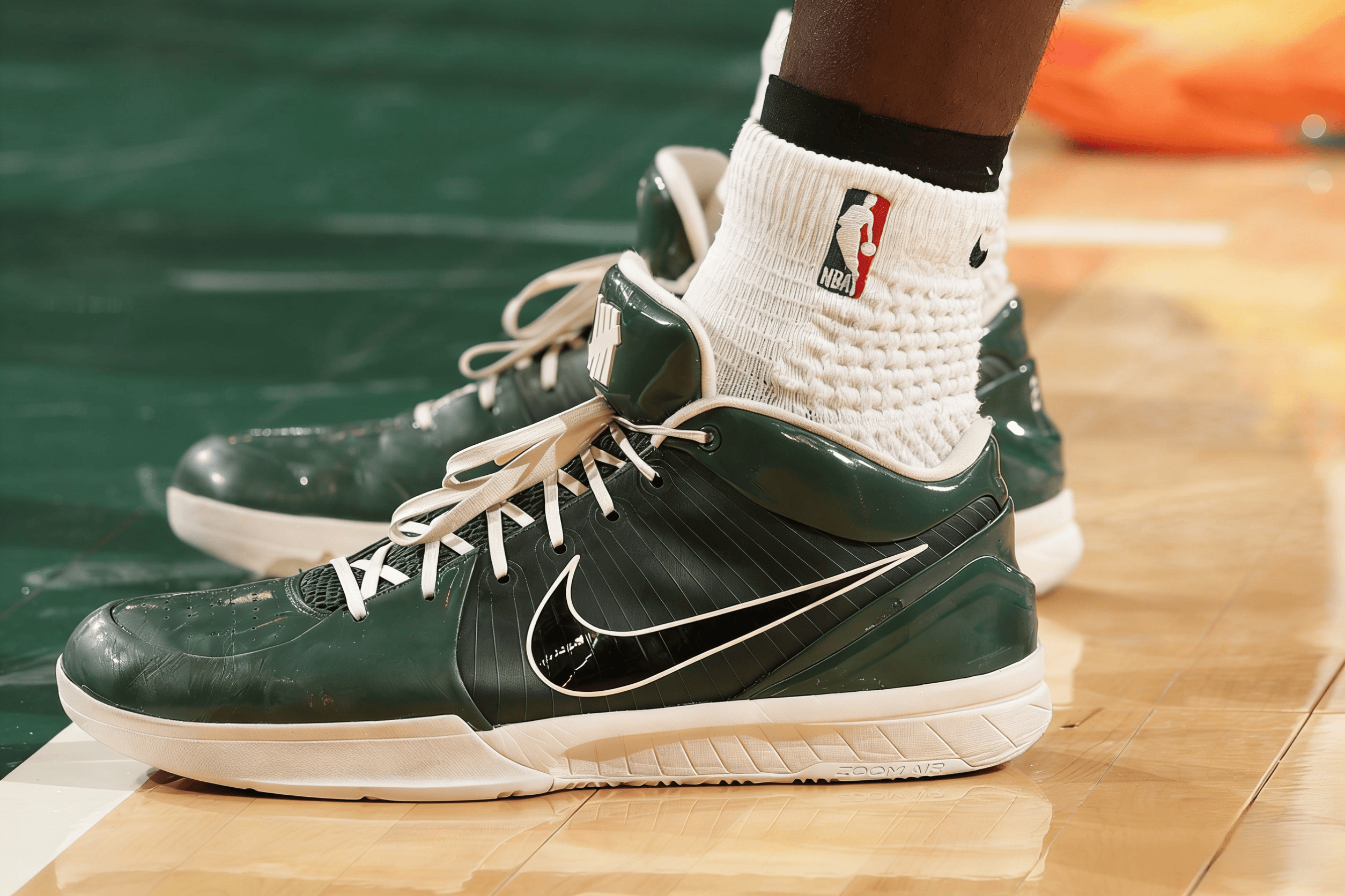 比賽中,波蒂斯上腳Undefeated聯(lián)名款雄鹿配色Nike Kobe 4 Protro。