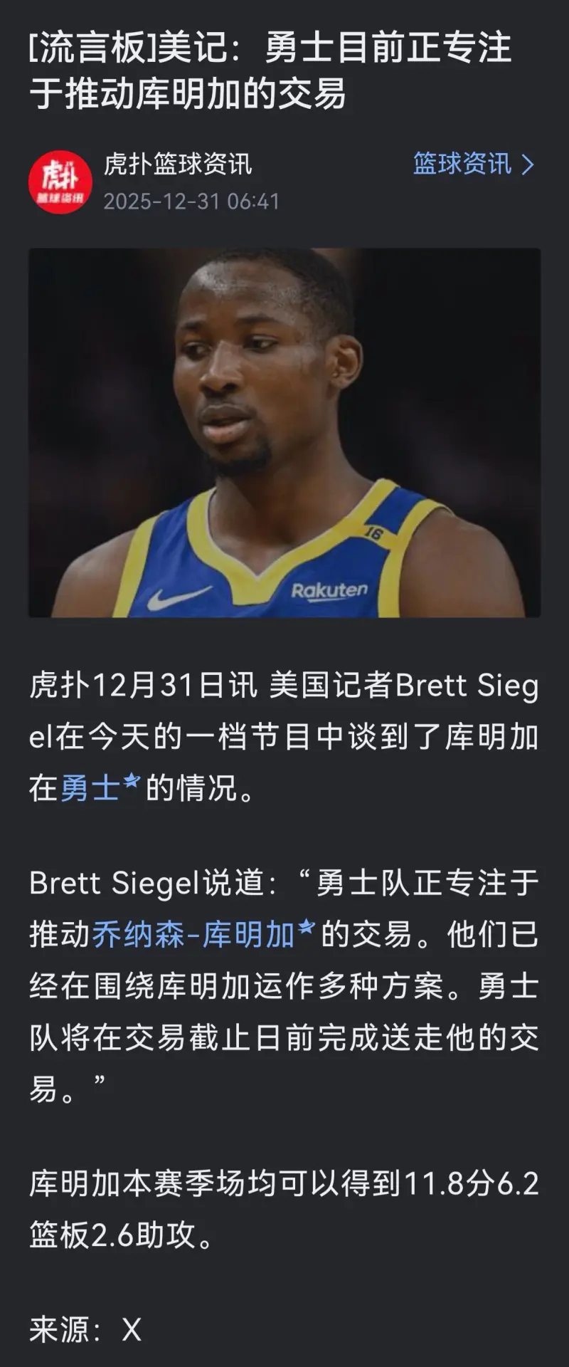 Brett Siegel說道:“勇士隊正專注于推動喬納森-庫明加的平合交易。他們已經(jīng)在圍繞庫明加運作多種方案。輪簽留下勇士隊將在交易截止日前完成送走他的庫明交易。”