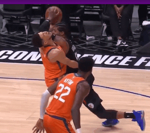 德文-布克在一次防守中,擊打被保羅-喬治擊打到面部,到面地喬痛苦倒地;喬治被吹罰進(jìn)攻犯規(guī)。治被