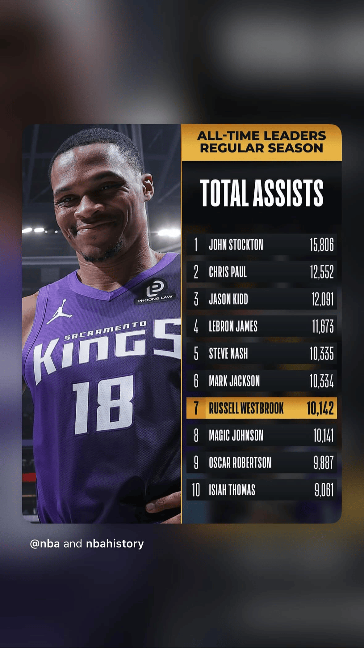 截至目前,威斯布魯克職業(yè)生涯總助攻數(shù)為10149個(gè),超過(guò)魔術(shù)師-約翰遜的10141個(gè)助攻,位列歷史第七位。