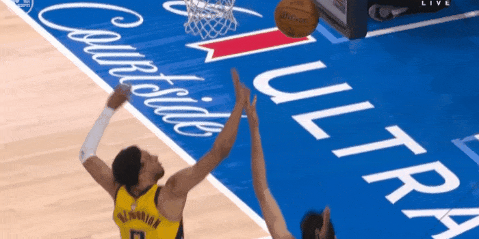 第四節(jié)比賽中,權(quán)雷權(quán)哈利伯頓點板出界后吹罰步行者球權(quán),霆挑雷霆挑戰(zhàn)成功拿回球權(quán)。功拿