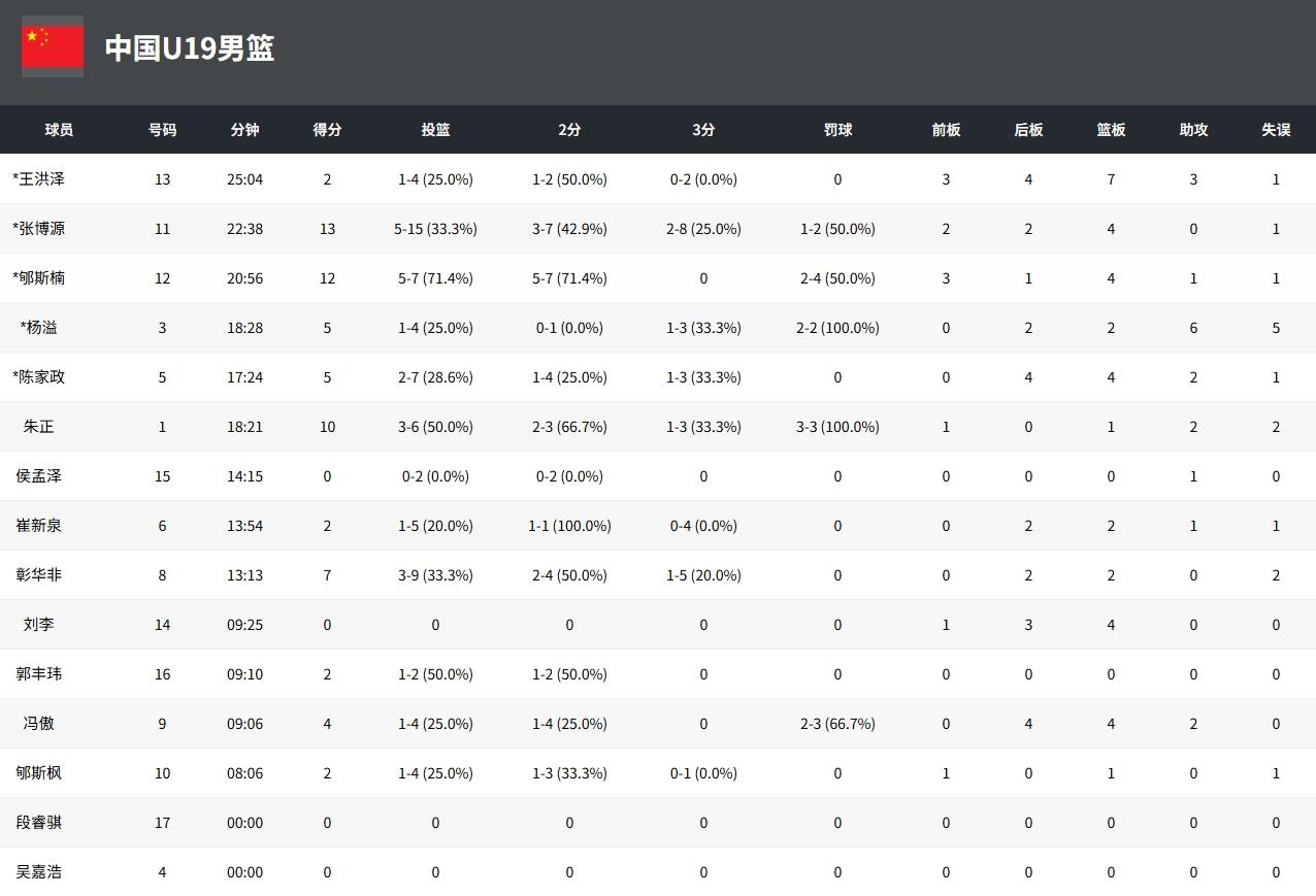中國U19男籃數(shù)據(jù)方面,張博源砍下全隊(duì)最高的13分外加4籃板,郇斯楠12分4籃板1助攻,朱正10分2助攻。