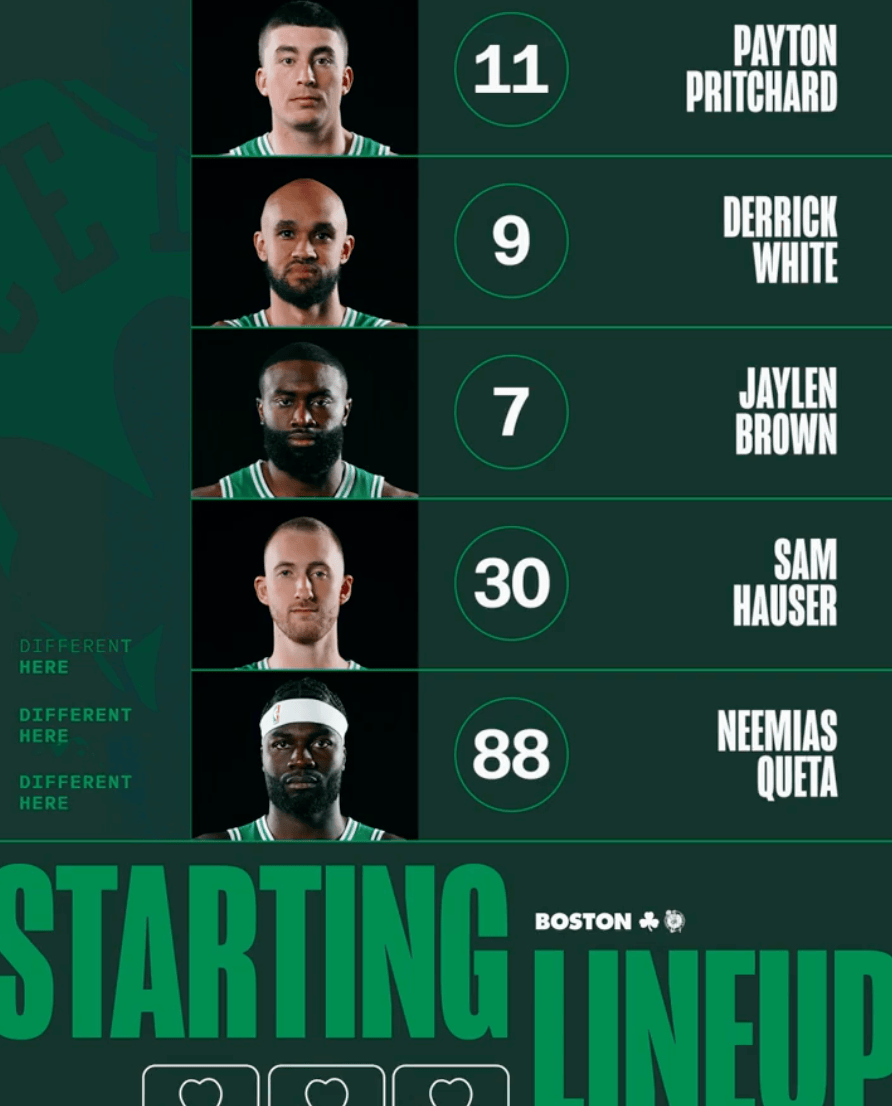 賽前,流言里查倫凱爾特人官方公布球隊本場首發(fā)陣容:德里克-懷特、佩頓-普里查德、杰倫-布朗、薩姆-豪瑟和內(nèi)米亞斯-克塔。