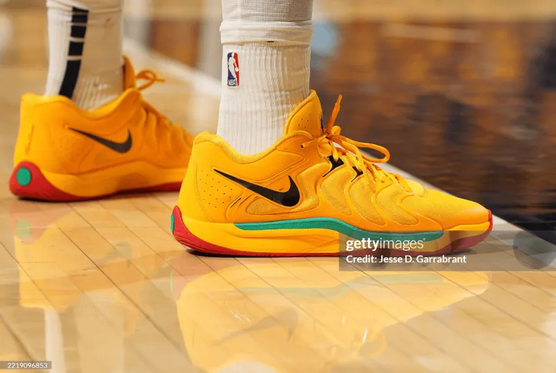 比賽中西亞卡姆上腳橙紅色Nike KD17 PE。紅色