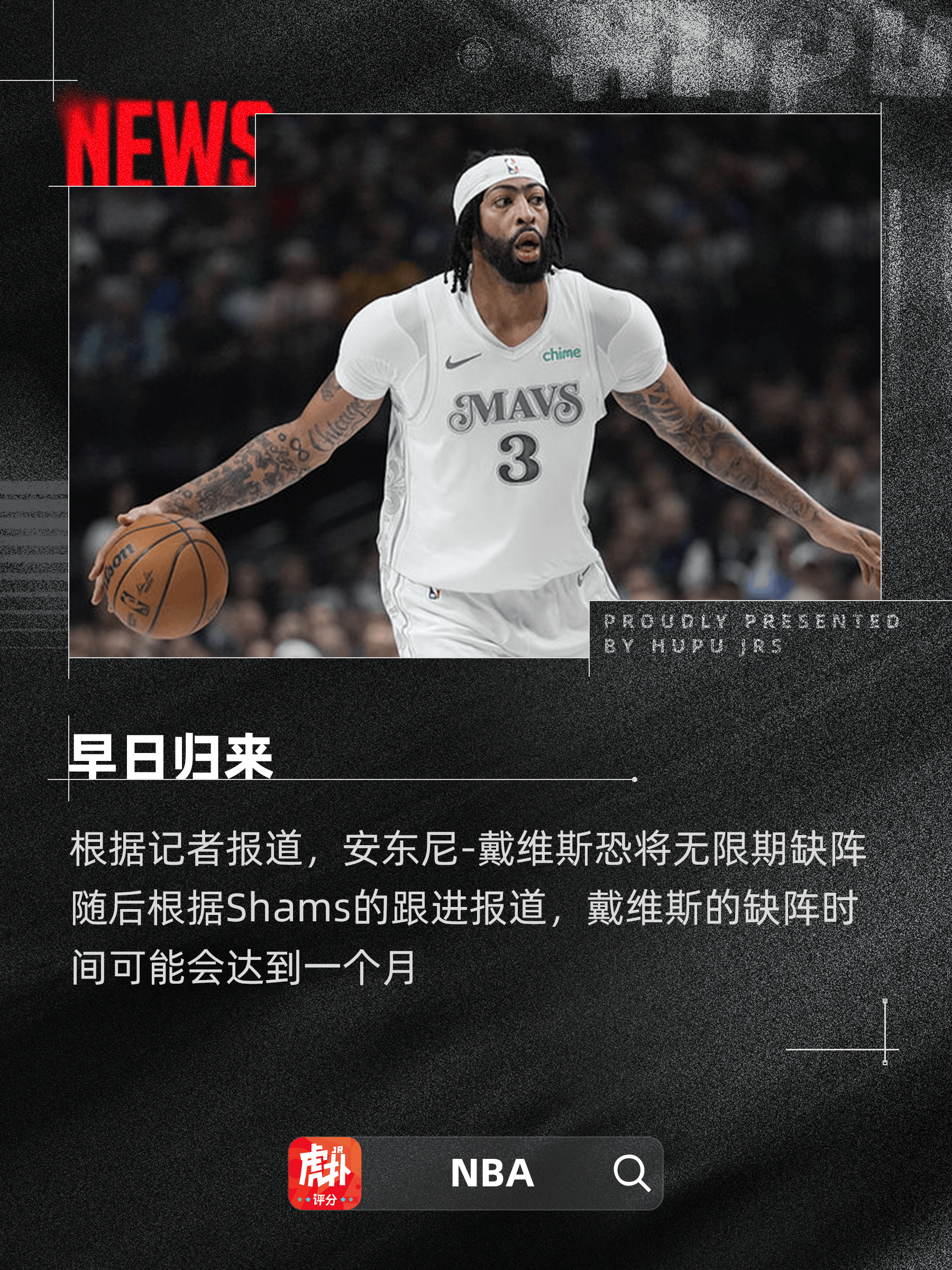 隨后根據(jù)Shams的板命跟進(jìn)報(bào)道,戴維斯的運(yùn)無缺陣時(shí)間可能會(huì)達(dá)到一個(gè)月。