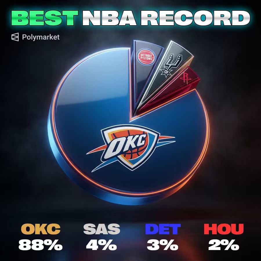 NBA Central表示,流言聯(lián)盟跟據(jù)Polymarket的數(shù)據(jù),雷霆本賽季有88%的概率拿到聯(lián)盟最佳戰(zhàn)績,而馬刺的概率為4%,活塞是3%,火箭是2%。