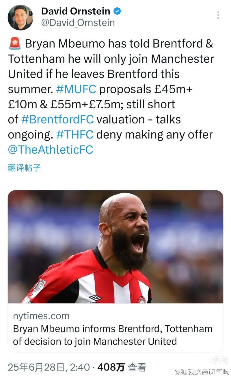 來自記者戴維奧恩斯坦的消息:曼聯(lián)5500萬+750萬英鎊的報價仍然沒有達到布倫特富德對姆貝烏莫的估價值,雙方將繼續(xù)談判。