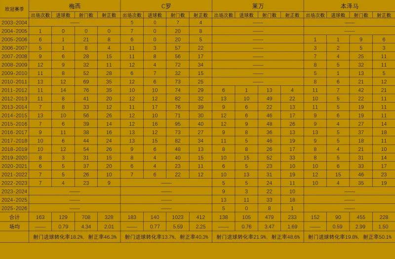 此表中3人的歐冠數(shù)據(jù)應(yīng)該不會再有變化,只萊萬目前還在跟隨巴薩可以踢歐冠,故萊萬的數(shù)據(jù)采用截止至發(fā)帖日期。