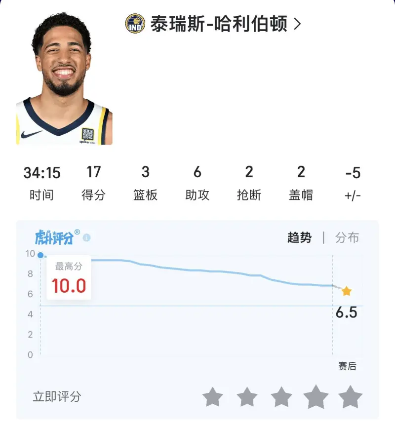 步行者球員泰瑞斯-哈利伯頓的板哈個(gè)人評(píng)分在開場(chǎng)時(shí)達(dá)到滿分10分,然后隨比賽進(jìn)程不斷下滑,頓開斷下賽后跌至6.5分。