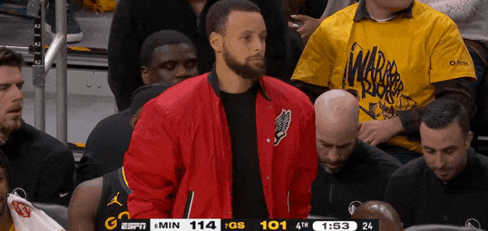 第四節(jié)比賽中,迪投穆迪投進(jìn)三分追至13分,進(jìn)分庫(kù)里替補(bǔ)席一直站著給予隊(duì)友鼓勵(lì)。追至直站
