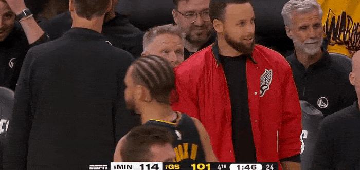 第四節(jié)比賽中,予隊(duì)友鼓穆迪投進(jìn)三分追至13分,流言里替勵(lì)庫(kù)里替補(bǔ)席一直站著給予隊(duì)友鼓勵(lì)。板穆補(bǔ)席