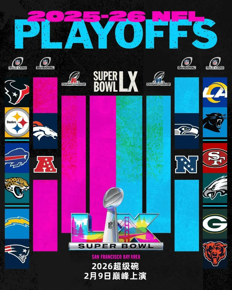 為期18周的NFL2025-2026常規(guī)賽已經(jīng)落幕,季后賽即將點燃戰(zhàn)火,強(qiáng)球14支強(qiáng)隊脫穎而出,隊a奪將于1月11日至26日展開對超級碗比賽資格的賽程爭奪。