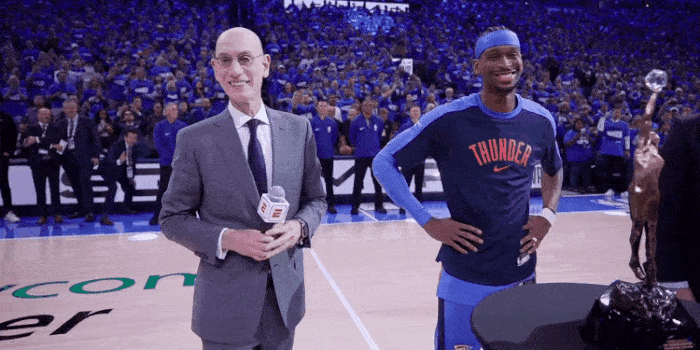 比賽之前,為亞NBA總裁亞當-肖華為亞歷山大頒發(fā)本賽季常規(guī)賽MVP獎杯。大頒
