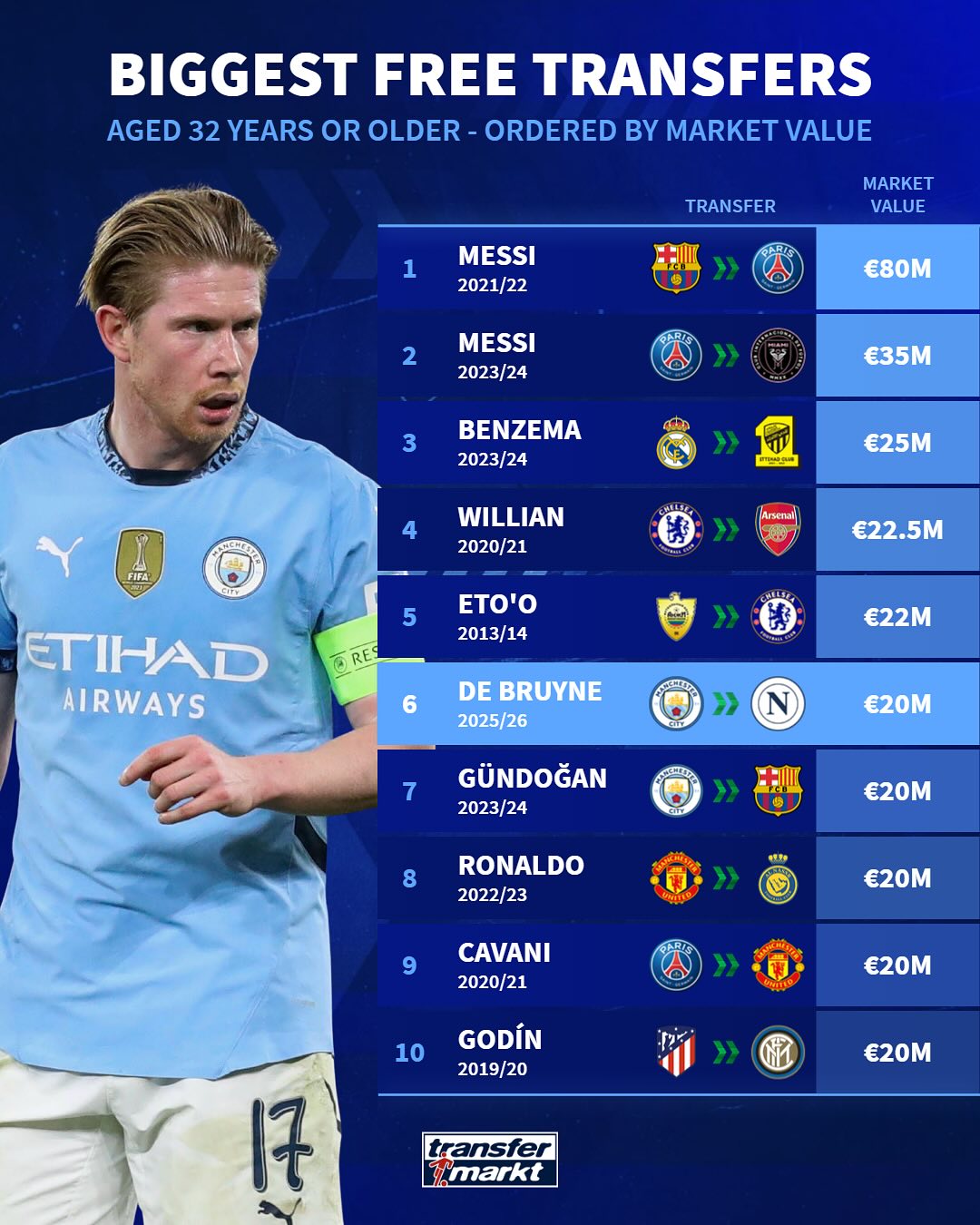 虎撲06月13日訊 那不勒斯官方宣布,簽下比利時(shí)中場(chǎng)德布勞內(nèi)。德國(guó)轉(zhuǎn)會(huì)市場(chǎng)盤(pán)點(diǎn)了一些球星在32歲以上的年齡,進(jìn)行自由轉(zhuǎn)會(huì)時(shí)的身價(jià):