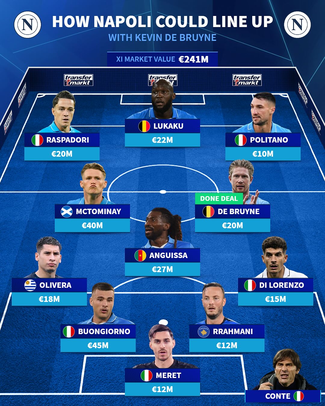 虎撲06月13日訊 那不勒斯簽下了比利時(shí)中場(chǎng)德布勞內(nèi),德國(guó)轉(zhuǎn)會(huì)市場(chǎng)預(yù)測(cè)了該球隊(duì)新賽季可能的斯新賽季首首發(fā)陣容: