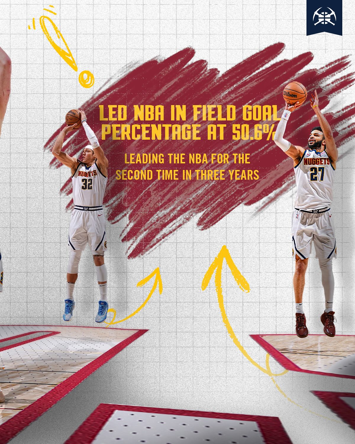 上賽季,隊(duì)上掘金進(jìn)攻效率120.9,賽季隊(duì)史最佳&聯(lián)盟第三;投籃命中率50.6%,總體三年來第二次領(lǐng)跑全聯(lián)盟。