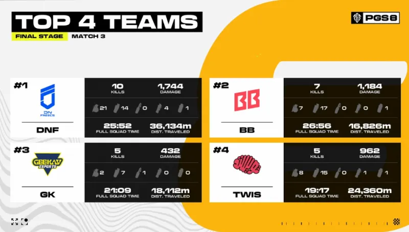 決賽圈刷在地圖BukSanMa南部山地,T1獨狼被DNF發(fā)現(xiàn),T1獨狼被淘汰出局。另外一側(cè),BB利用道具將GK淘汰出局。場上最后剩余DNF與BB兩支隊伍,雙方均為滿編。BB選擇開車撞擊DNF近點,但被DNF輕松化解,DNF成功吃雞。