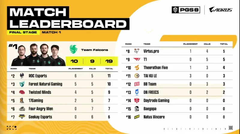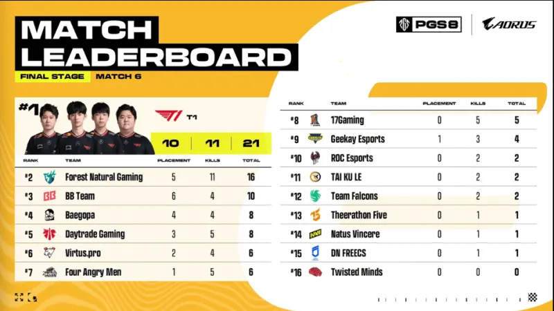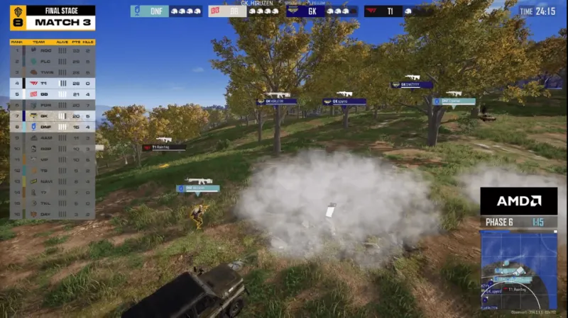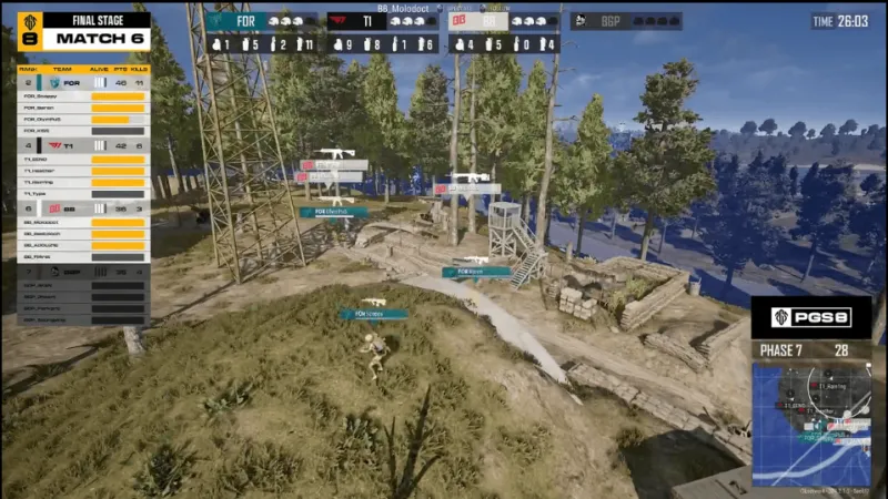 決賽圈,F(xiàn)OR先被T1和BB兩隊夾擊淘汰,最終場上剩余T1和BB進(jìn)行3v3,T1占據(jù)地形和槍線優(yōu)勢,T1利用道具打開突破口,隨后一起壓上淘汰對方成功吃雞。