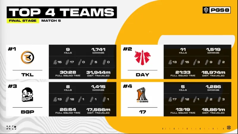 決賽圈,17利用道具集火先進(jìn)圈內(nèi)低點的ROC淘汰出局。場上剩余四支隊伍,BGP先被多隊逐個擊破,率先被淘汰。隨后17也被兩隊夾擊下淘汰,最后TKL將DAY最后兩人淘汰,最終TKL成功吃下一雞。