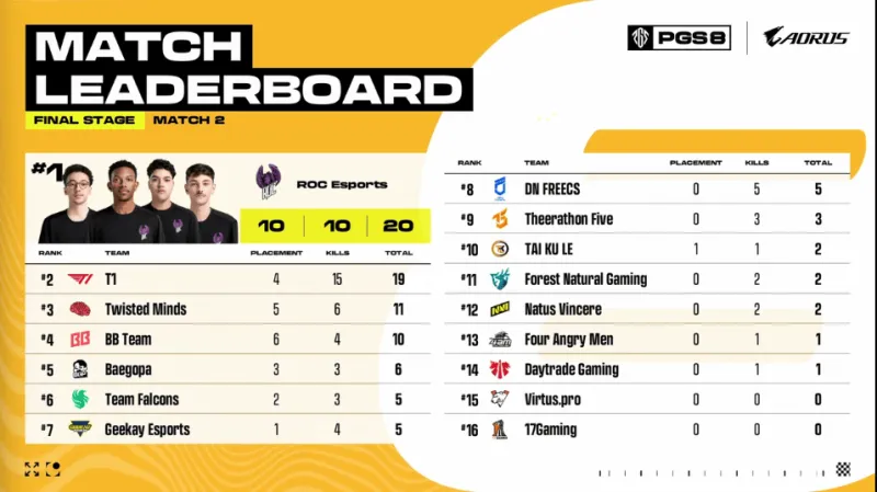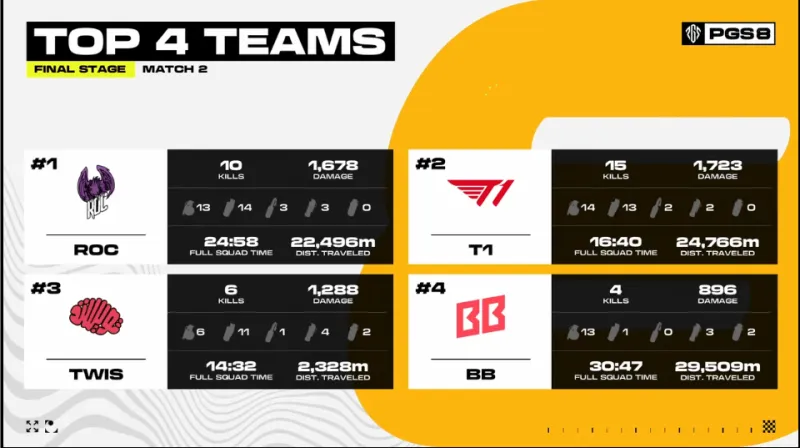 決賽圈,TWIS獨狼先被淘汰止步第三,場上剩余兩支隊伍。最后ROC槍法發(fā)揮兩人淘汰BB四人成功吃雞。