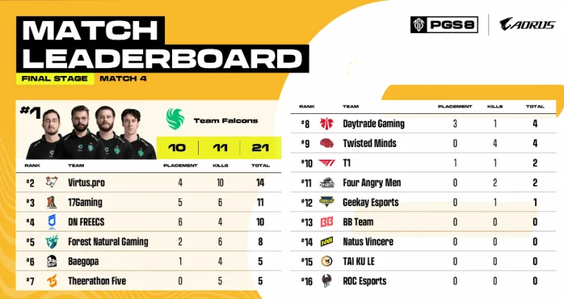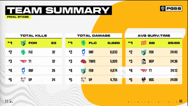 階段5,4AM圈邊將FLC兩人淘汰,但自身也被擊倒兩人,隨后BGP前來勸架,利用道具將4AM淘汰。TWIS選擇進(jìn)攻DAY,擊倒DAY三人后也被遠(yuǎn)點槍線淘汰。