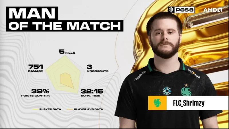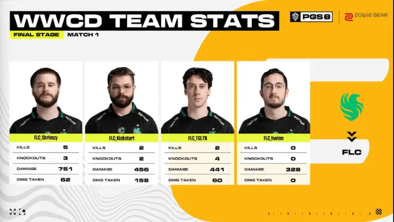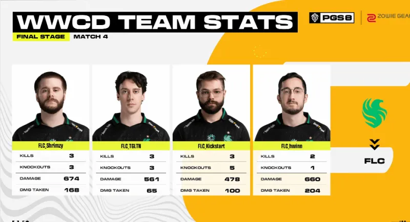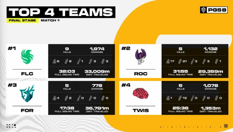 決賽圈四支隊伍,TWIS從高點落地但被FLC淘汰出局,隨后FOR獨狼也被淘汰。最后FLC占據(jù)地形優(yōu)勢再將ROC輕松淘汰,成功吃雞。