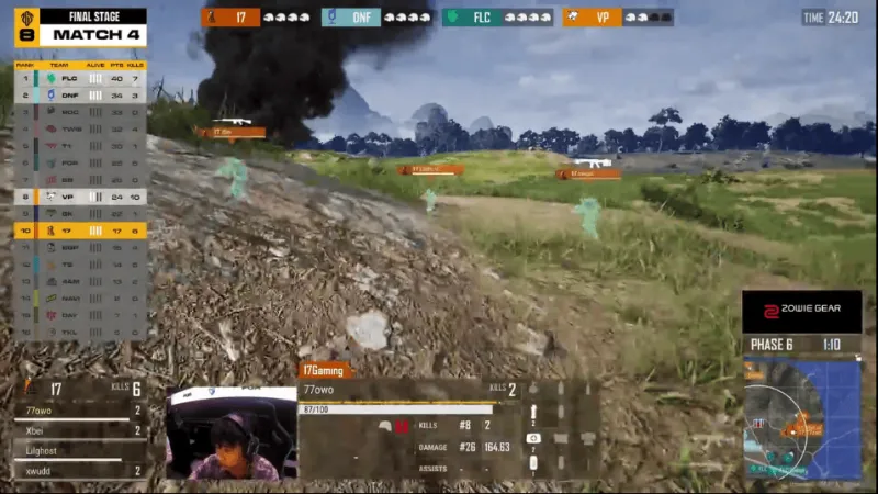 階段6,F(xiàn)OR在圈邊被兩隊夾擊,F(xiàn)OR先被淘汰。DAY獨狼選擇開車進(jìn)圈,但被遠(yuǎn)處FLC槍線淘汰。