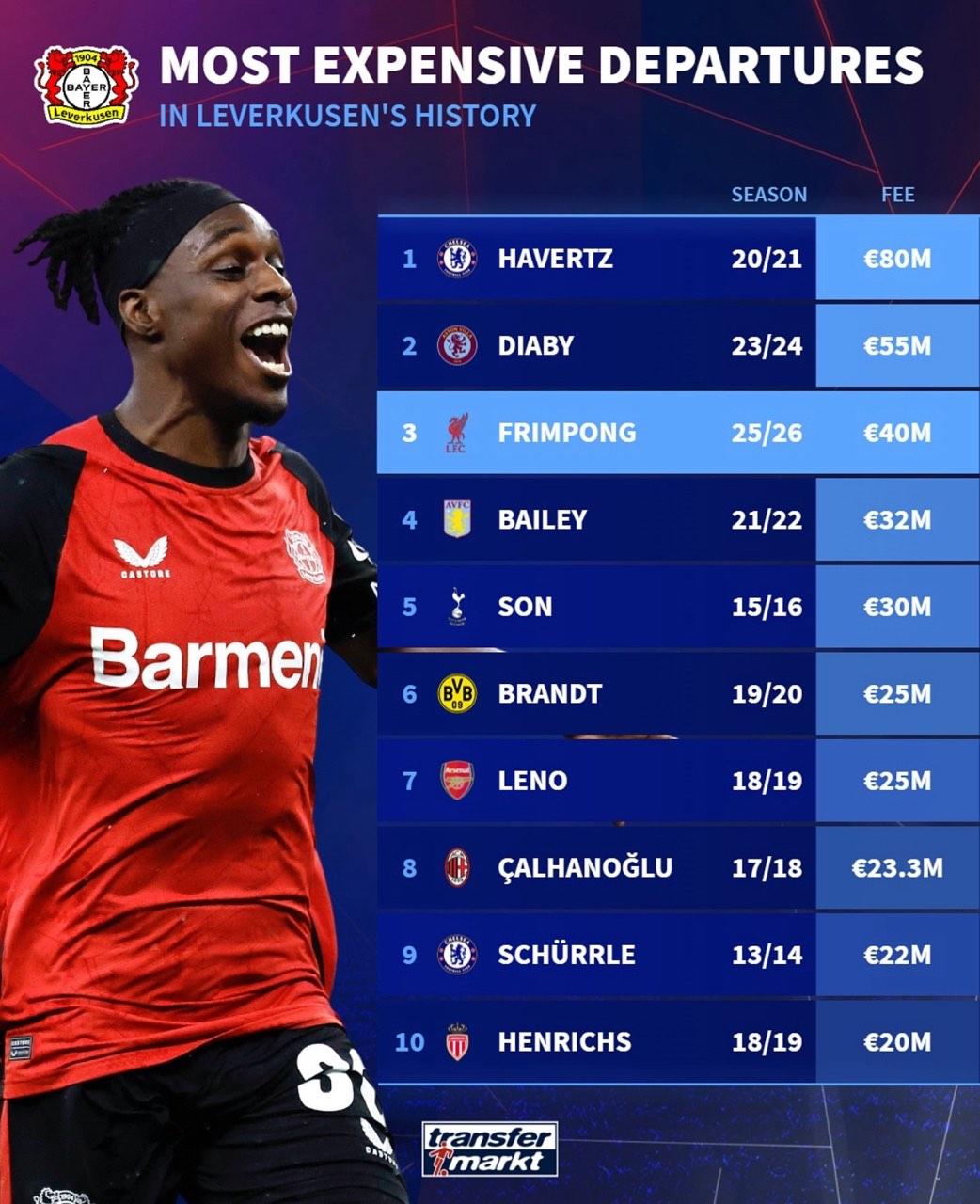 德轉(zhuǎn)盤點(diǎn)了勒沃庫森隊(duì)史最昂貴的點(diǎn)勒第10筆球員出售交易(單位:歐元):