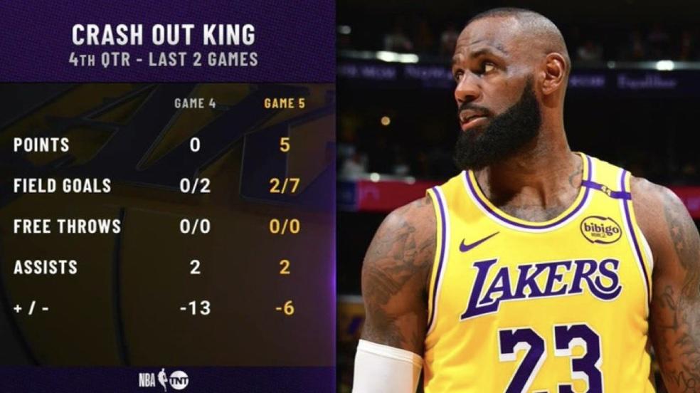 最近2場(chǎng)與森林狼系列賽的G4和G5比賽里,詹姆斯在第四節(jié)累計(jì)9投2中,沒(méi)有獲得罰球,合計(jì)得到5分4助攻,累計(jì)正負(fù)值-19。