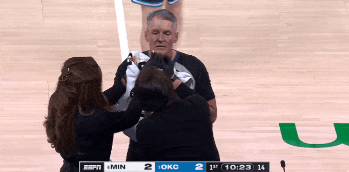 第一節(jié)比賽中,戰(zhàn)福福斯特被打臉流鼻血緊急處理,緊急繼續(xù)隨后繼續(xù)吹罰比賽。處理吹罰