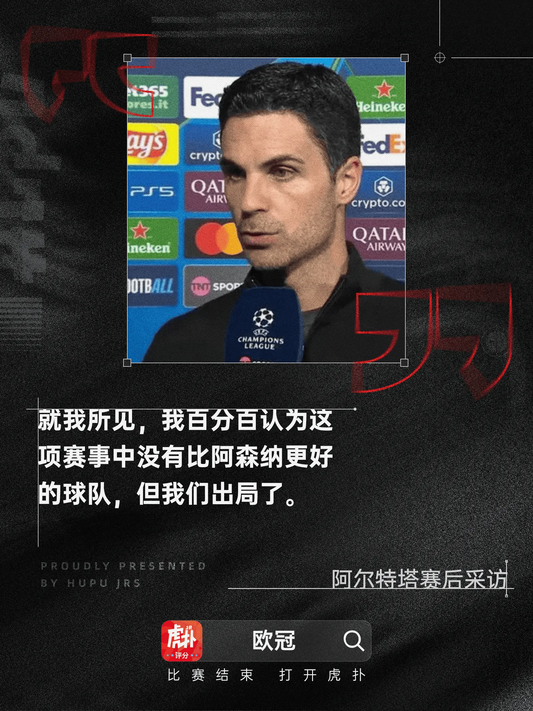“回顧這兩場比賽,他們場上最好的球員都是門將,他幫助球隊(duì)取得了勝利。我覺得阿森納非常接近(We were very close),比結(jié)果顯示的要接近得多,但不幸的是我們出局了。我為球員們感到非常驕傲?!?/p>
