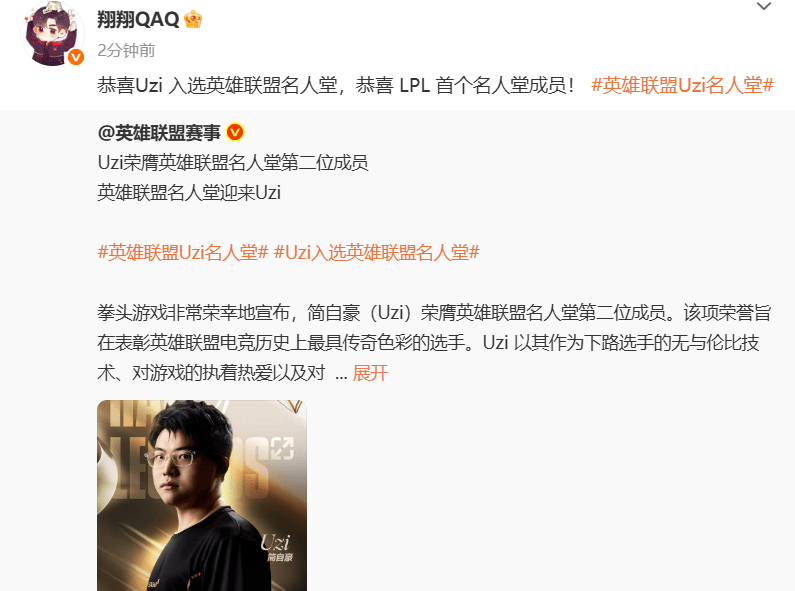 恭喜Uzi入選英雄聯(lián)盟名人堂,轉(zhuǎn)發(fā)祝賀恭喜LPL首個(gè)名人堂成員!入選?