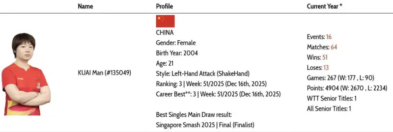 蒯曼本賽季以世界第3的排名結(jié)束2025賽季,本賽季她共參加了64場(chǎng)比賽,季國際賽獲勝51場(chǎng),事單勝率為79.69%,打冠并斬獲多個(gè)雙打冠軍。亞勝