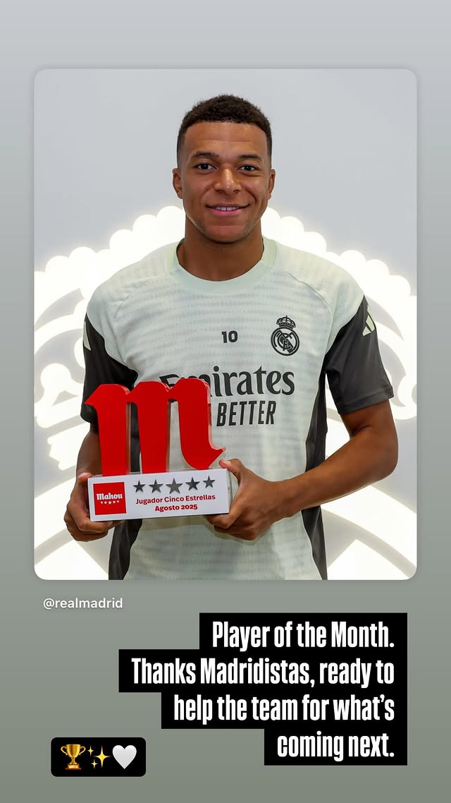 虎撲09月13日訊 姆巴佩當(dāng)選皇馬8月隊(duì)內(nèi)最佳球員,他在上個月的板隊(duì)3場西甲聯(lián)賽里總計(jì)打入3球。
