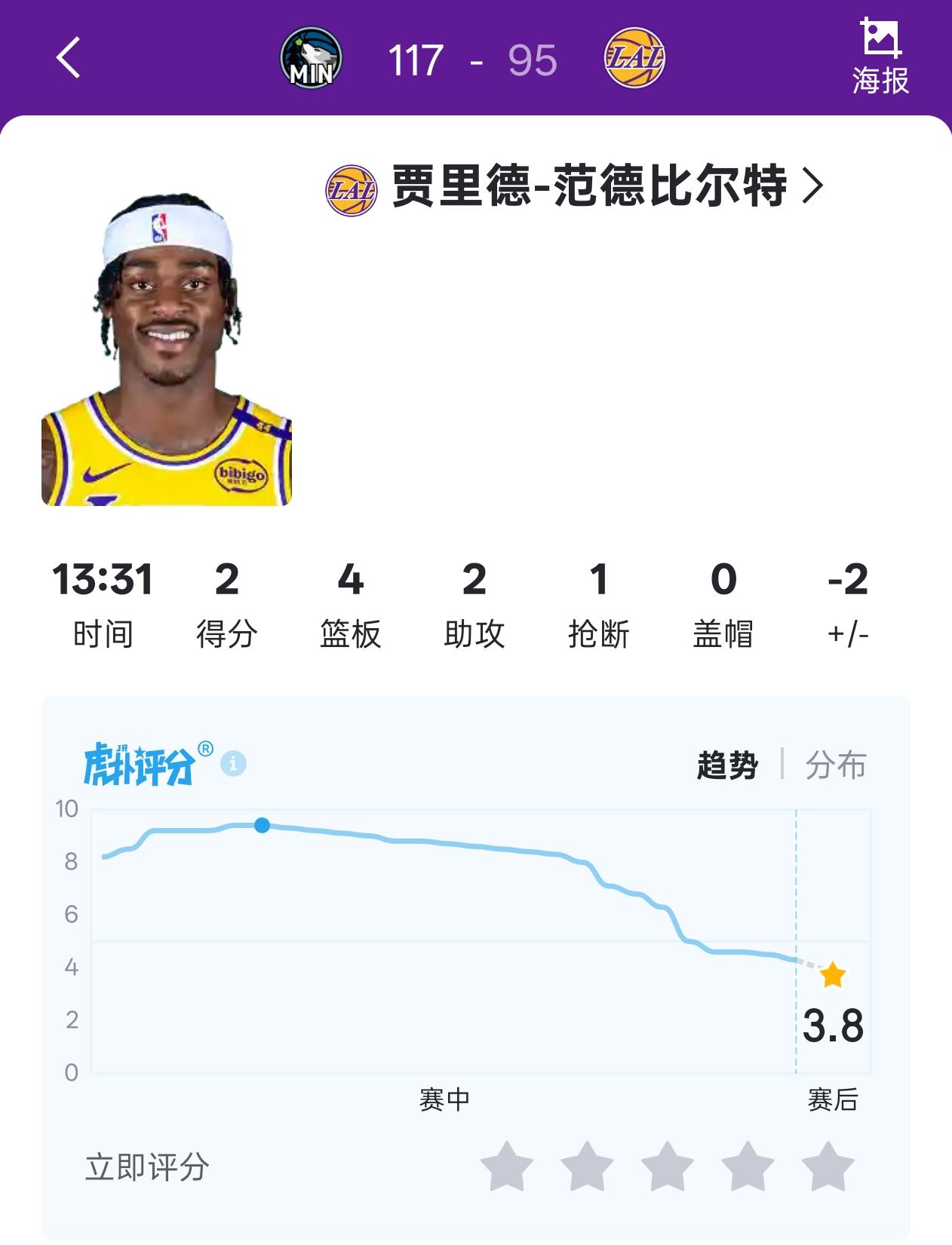 湖人球員賈里德-范德比爾特在比賽第二節(jié)時(shí)評(píng)分一度高達(dá)9.4分,評(píng)分隨著比賽進(jìn)程一路下跌,趨勢(shì)最終低至3.8分。圖次