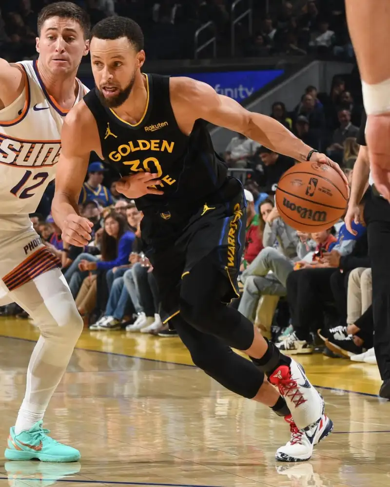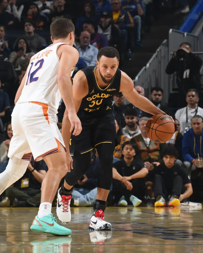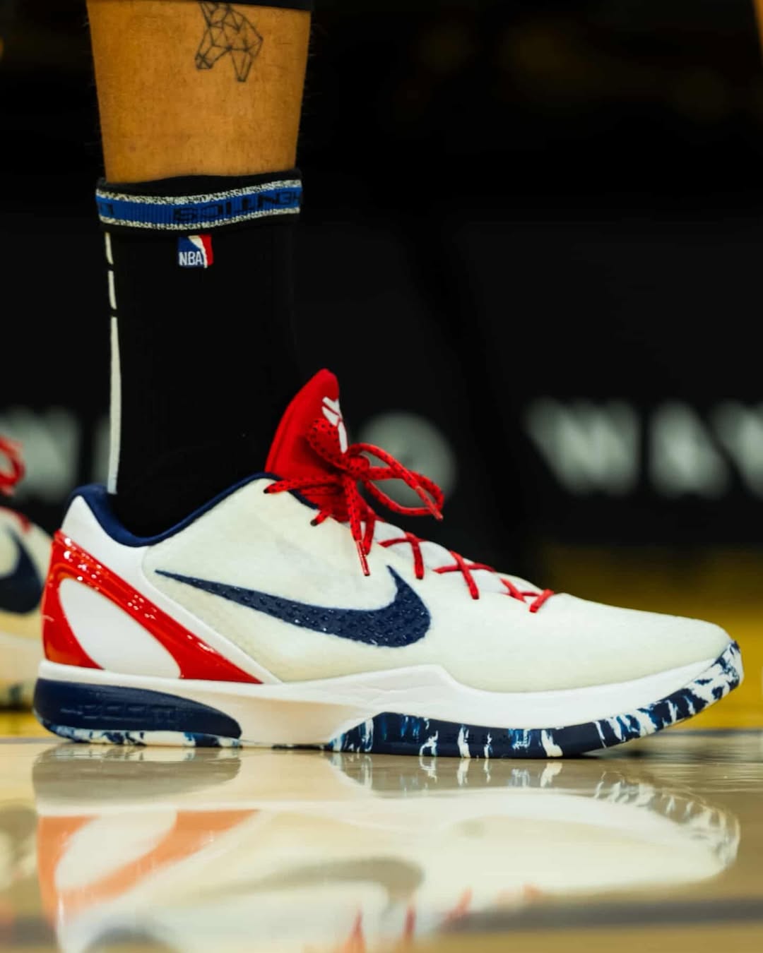 比賽中,庫里上腳Nike Kobe 6 Protro“USA”PE。今日NBA常規(guī)賽勇士119-116戰(zhàn)勝太陽。
