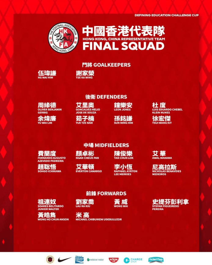 中國香港隊(duì)也在今日公布了本場(chǎng)比賽的24人大名單,名單中也包含了李小恒、孫銘謙、周緣德、茹子楠、徐宏杰、黃皓雋6名效力于中超的球員。