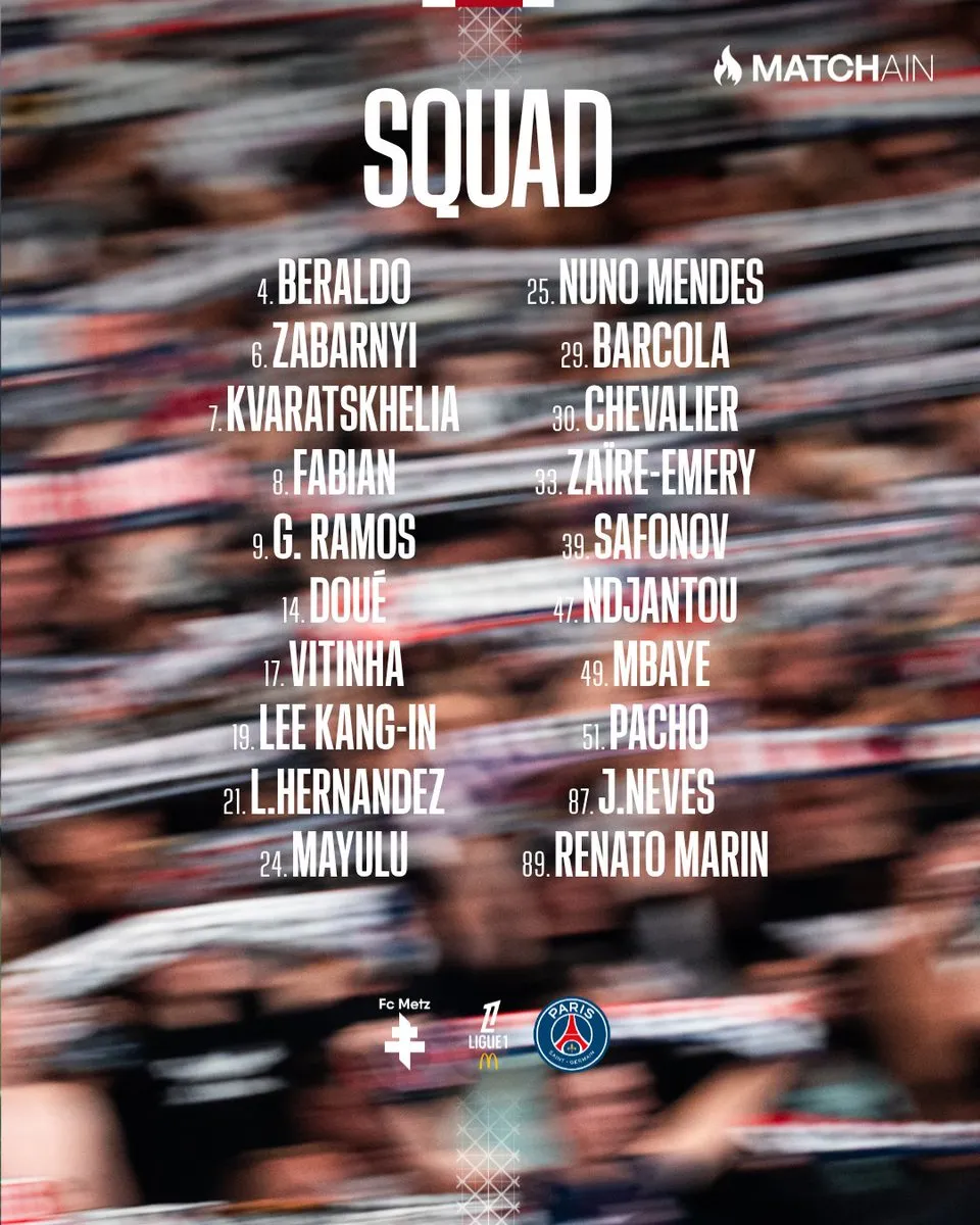 中場:8-法比安、17-維蒂尼亞、24-馬尤盧、33-扎伊爾-埃梅里、87-若昂-內(nèi)維斯