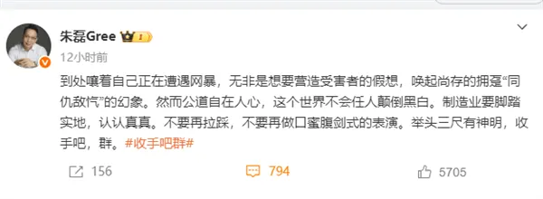 隨后在21:16分,朱磊緊接著又發(fā)布了一條“勸諫”言論:到處嚷著自己正在遭遇網(wǎng)暴,無(wú)非是想要營(yíng)造受害者的假想,喚起尚存的擁躉“同仇敵愾”的幻象。